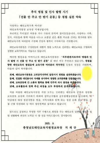 [뉴스스텝] 충청남도태안교육지원청은 추석 연휴 시기를 맞아 청렴한 공직문화를 확산하기 위해 ‘선물 안 주고 안 받기 운동’을 강조하는 청렴 서한문을 홈페이지에 게시했다.
