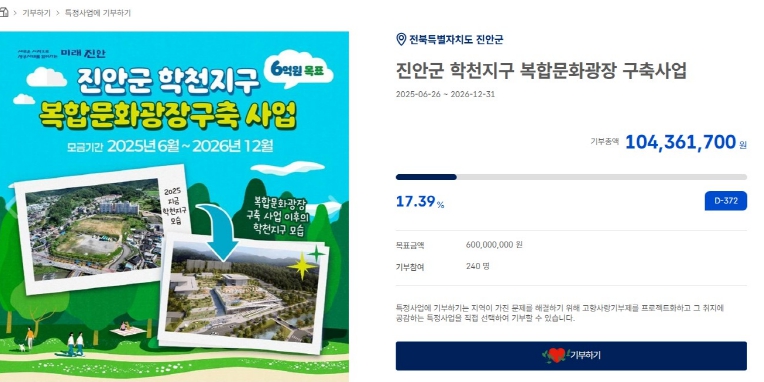 [뉴스스텝] 진안군이 고향사랑기부제 지정기부사업으로 지난 6월부터 추진 중인 “학천지구 복합문화광장 구축사업”이 모금 시작 6개월 만에 누적 모금액 1억 원을 달성했다.