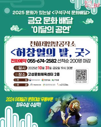 [뉴스스텝] 고성군은 10월 31일, 고성군 문화체육센터 공연장에서 2025년 문화체육관광부 공모사업으로 선정된 ‘문화가 있는 날 구석구석 문화배달사업’의 10월 공연으로 천하제일탈공작소의 “허창열의 탈, 굿”을 선보인다.