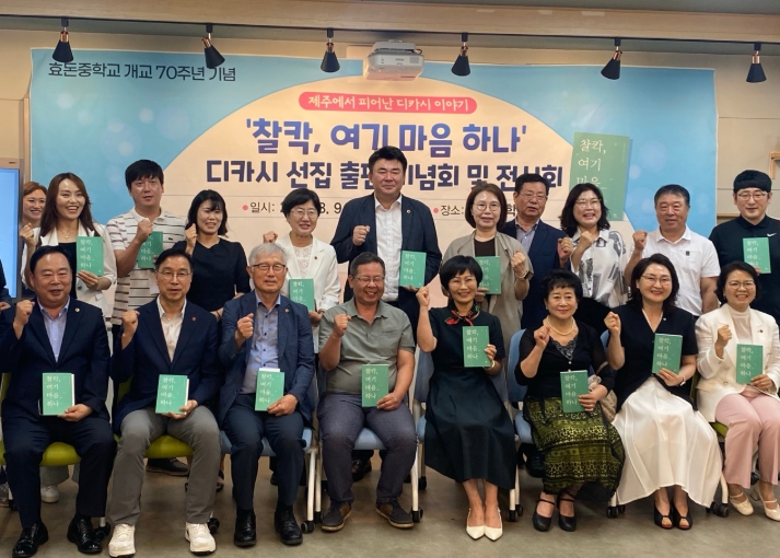 [뉴스스텝] 제주도교육청 효돈중학교는 9일 오전 10시 학교 도서관과 전시 공간에서 개교 70주년을 기념하는 디카시 선집 ‘찰칵, 여기 마음 하나’출판 기념회 및 전시회를 성황리에 개최했다.