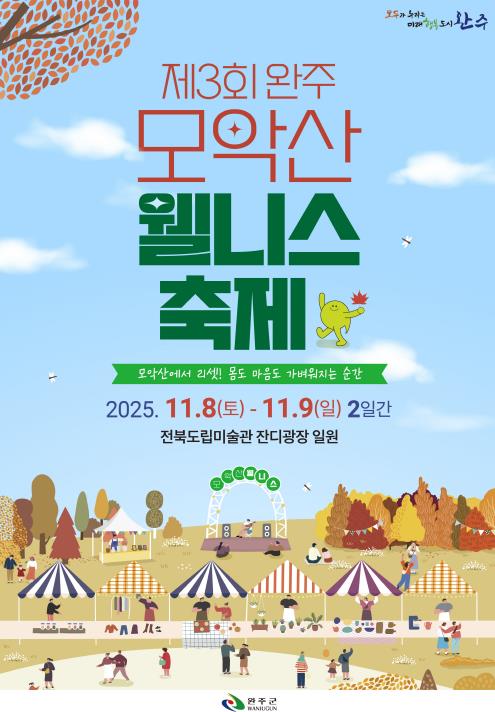 [뉴스스텝] 완주군은 오는 11월 8일부터 9일까지 전북도립미술관 야외광장 일원에서 웰빙, 건강, 행복을 주제로 ‘제3회 완주 모악산 웰니스 축제’를 개최한다.