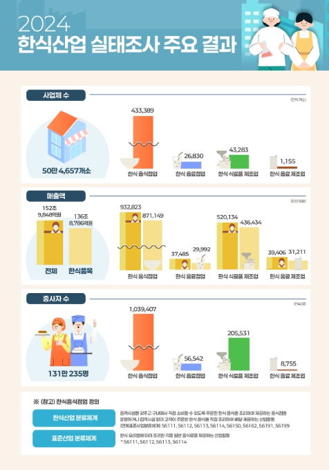 조사결과 2024년 한식산업 전체 사업체 수는 50만 4,657개소이며, 업종별로 살펴보면 한식 외식업이 46만 219개소(음식점업 43만 3,389개소, 음료점업 2만 6,830개소), 한식 제조업체가 4만 4,438개소(식료품 제조업 4만 3,283개소, 음료 제조업 1,155개소)로 나타났다.