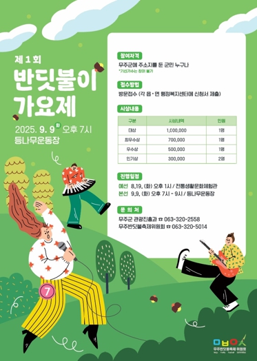 [뉴스스텝] 무주 반딧불이 가요제가 무주군민 화합 축제로 제29회 무주반딧불축제에서 부활한다. 9월 9일 제29회 무주반딧불축제장(등나무운동장 주무대)에서 개최될 예정으로 무주반딧불축제위원회는 오는 8월 8일까지 참가 신청을 받는다.
