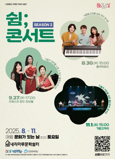 [뉴스스텝] (재)인천중구문화재단(이사장 김정헌)은 올 하반기 내리마루 문화쉼터에서 ‘쉼; 콘서트 시즌2’와 ‘그림책 문학 쉼터’ 등 다채로운 지역문화 활성화 프로그램을 선보인다고 12일 밝혔다.