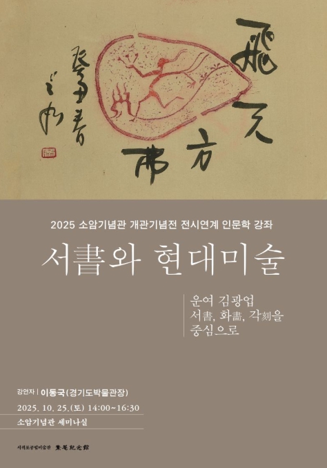 소암기념관은 매년 문화예술계의 석학들을 초빙해 다양한 주제로 인문학 강좌를 개최하고 있으며, 이번 강좌는 현재 전시 중인 《서귀소옹과 20세기 서화거장 10th – 운여 김광업, 마음그림》과 연계해 마련됐다.