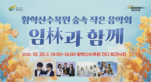 여주시 산림공원과장(장홍기)은 “황학산수목원의 아름다운 가을 풍경과 함께 음악이 주는 위로와 자연의 평온함을 동시에 느낄 수 있는 특별한 시간이 되길 바란다”라며 “많은 시민이 함께하며 여주의 가을을 만끽하길 바란다”라고 말했다.