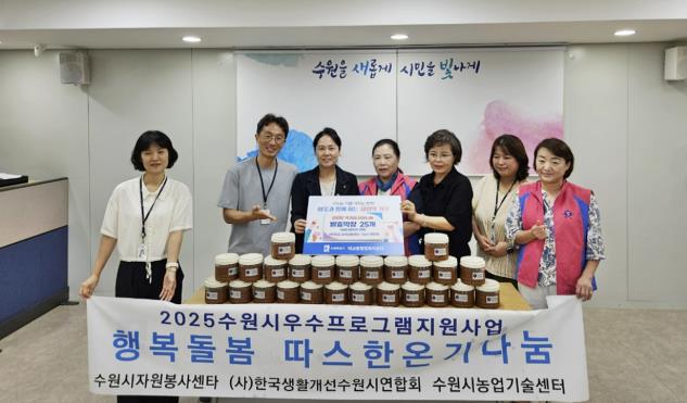 [뉴스스텝] 사단법인 한국생활개선 수원시 연합회는 김미경, 국미순 수원특례시 의원과 함께 지난 18일 수원시 팔달구 매교동행정복지센터에 관내 어려운 이웃 25가구에 건강한 먹거리 발효막장을 후원했다.
