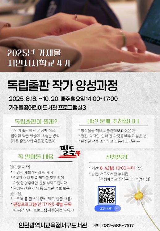 [뉴스스텝] 인천광역시교육청서구도서관은 가재울 시민저자학교 4기 프로그램으로 ‘읽걷쓰 독립출판 작가 양성과정’을 운영한다.