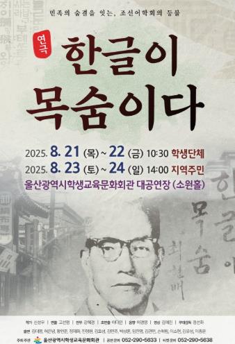 [뉴스스텝] 울산광역시학생교육문화회관은 광복 80주년을 맞아 21일부터 4일간 대공연장 소원홀에서 연극 ‘한글이 목숨이다’를 공연한다.