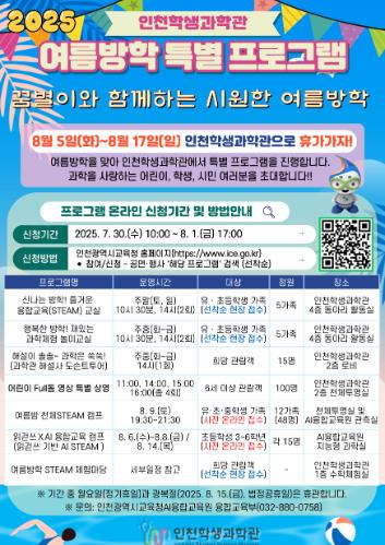 [뉴스스텝] 인천광역시교육청AI융합교육원은 여름방학을 맞아 8월 5일부터 17일까지 인천학생과학관에서 특별 프로그램 ‘꿈별이와 함께하는 시원한 여름방학’을 운영한다.