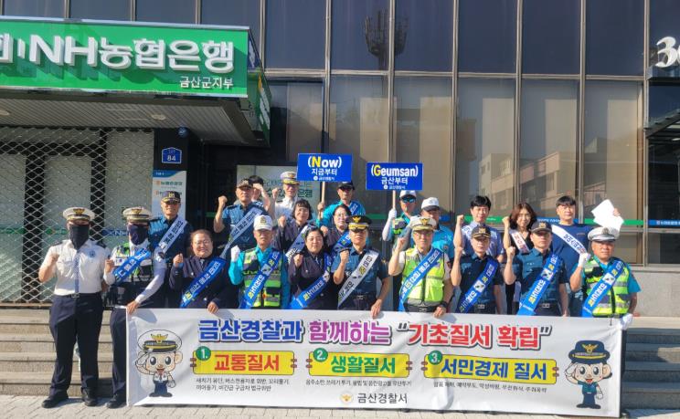 [뉴스스텝] 금산경찰서는 7월 9일 오전 8시경 NH농협은행 금산군지부 사거리에서 경찰서장을 비롯하여 생활안전교통 · 범죄예방대응 · 수사과의 경찰서 직원들과 모범운전자회, 녹색어머니회 등 3개 단체 약 30명이 참여한 가운데 “기초질서 준수 나(I)부터, 지금(N)부터, 금산(G)부터” 공동체 신뢰 회복 캠페인을 진행했다.