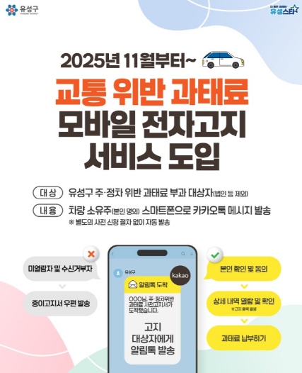 [뉴스스텝] 대전 유성구는 교통위반 과태료 고지서를 스마트폰으로 받아볼 수 있는 ‘모바일 전자고지 서비스’를 11월부터 본격 시행한다고 30일 밝혔다.