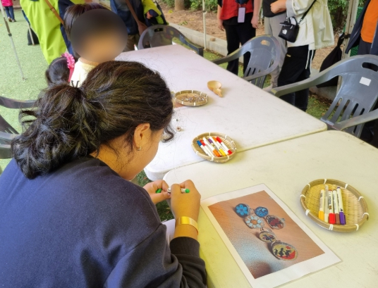 ▲ 지난해 진행한 유아숲 페스티벌에서 아이와 부모가 함께 나무에 그림을 그리고 있다. |