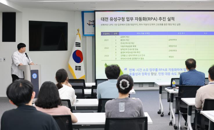 이번 교육은 AI(인공지능)·디지털 솔루션 전문 기업 ㈜경포씨엔씨와 협력해 마련됐으며, 유성구에서 도입한 RPA 시스템에 대한 안내와 개선 방안을 논의하고 다른 공공기관·지자체 등의 RPA 사례를 공유했다.