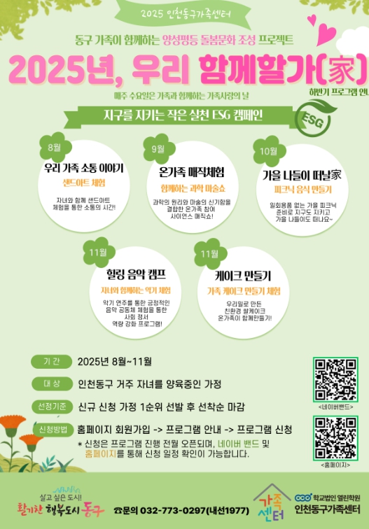 동구 양성평등기금 지원사업 공모 선정을 통해 진행되는 ‘함께할가(家)’ 는 인천동구가족센터의 경영방침인 ESG'환경(Environmental), 사회(Social), 지배구조(Governance)' 경영을 실천하여 모든 가족 구성원이 평등하게 자녀와 함께 시간을 보내 양육에 동참할 수 있도록 기획된 가족 단위 여가·문화 프로그램이다.