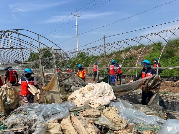 봉사자들은 폐허가 된 비닐하우스 농장 복구 활동에 참여해 비닐 철거와 스티로폼·토사·폐기물 제거 등 구슬땀을 흘리며 복구를 위해 온 힘을 쏟았다.