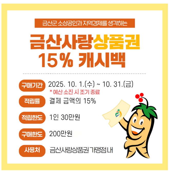 [뉴스스텝] 금산군은 지역 상권에 활기를 불어넣기 위해 9월부터 적용한 금산사랑상품권 캐시백 적립률 15%를 10월에도 유지한다.