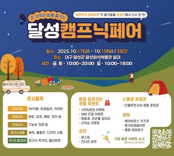 [뉴스스텝] 달성군은 오는 17일부터 19일까지 달성화석박물관 앞 광장에서 캠핑용품 전시·판매와 캠핑 문화를 체험할 수 있는 ‘달성캠프닉페어’를 개최한다고 밝혔다.
