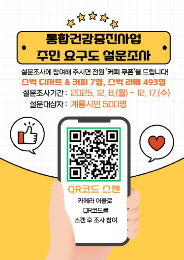 [뉴스스텝] 계룡시는 시민 건강증진을 위해 ‘2025년 통합건강증진사업 지역주민 설문조사’를 12월 8일부터 17일까지 온라인 방식으로 실시한다고 밝혔다.