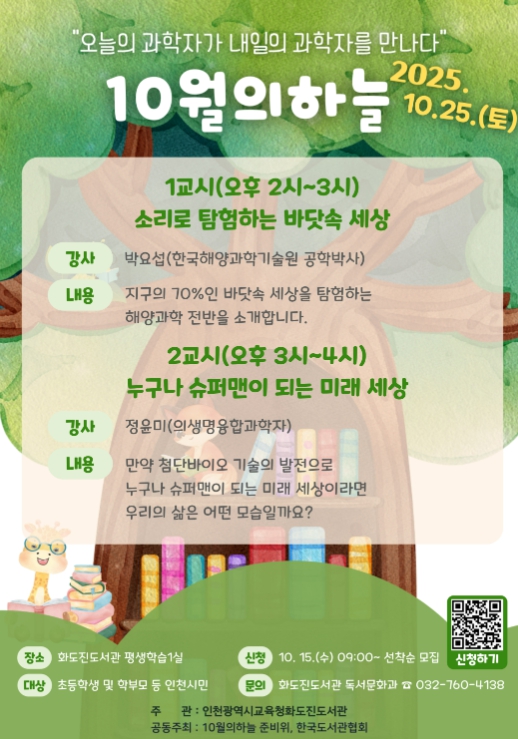 이번 강연은 화도진도서관 평생학습1실에서 열리며, ▲오후 2시 박요섭 한국해양과학기술원 공학박사의 ‘소리로 탐험하는 바닷속 세상’ ▲오후 3시 정윤미 의생명융합과학자의 ‘누구나 슈퍼맨이 되는 미래 세상’이 진행된다.