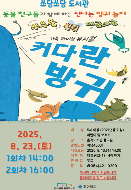 공연은 경상북도 저출생대응정책과에서 실시한 ‘2025년 저출생 대응 맞춤형 공모사업(결혼·출산·보육)’에 율곡도서관이 최종 선정되어 운영되는 것으로, 가족 뮤지컬 '커다란 방귀'는 ‘쓰담쓰담 도서관’ 프로그램의 첫 번째 공연이다.
