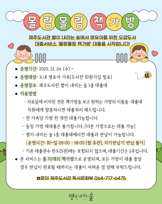 [뉴스스텝] 제주도교육청 제주도서관은 24일부터 영유아 오감도서 대출 서비스 ‘몰랑몰랑 책가방’을 운영한다.