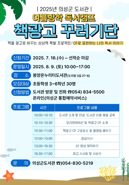 [뉴스스텝] 의성군은 오는 8월 9일, 봉양온누리터도서관에서 초등학생을 대상으로 책과 미디어를 결합한 여름방학 독서캠프 '책광고 꾸러기단'을 운영한다고 밝혔다.