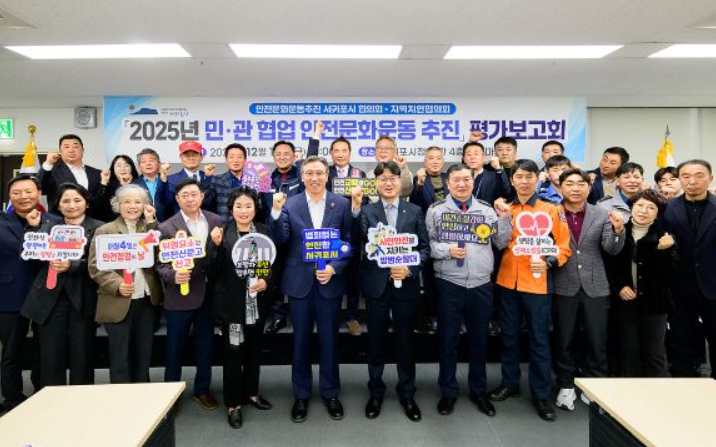 [뉴스스텝] 서귀포시는 12월 19일 10시 시청 별관 4층 별넷마당에서 오순문 서귀포시장을 비롯해 교육지원청‧경찰서‧자치경찰단‧소방서‧해양경찰서 등 유관기관장과 오창훈 시 주민자치위원회협의회장, 시민사회단체장 등 안전문화운동추진 서귀포시협의회 위원 30여 명이 참석한 가운데 ‘2025년도 민‧관협업 안전문화운동 추진 평가보고회’를 개최했다.