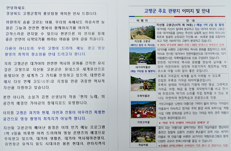 서한문에는 고령군의 우수한 영상 촬영 장소의 사진과 각종 자료를 첨부하여 제작자들이 고령군의 빼어난 촬영 스팟을 시각적으로 볼 수 있게 했다.