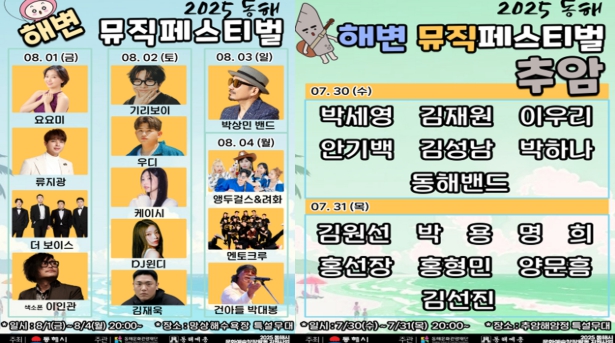 ‘2025 해변 뮤직 페스티벌’은 7월 30일부터 31일까지는 추암해변(해암정 일원), 8월 1일부터 4일까지는 망상해변(데크 광장 일원)에서 진행되며, 매일 저녁 8시부터 10시까지 6일간 열린다. 낭만적인 해변의 분위기 속에서 펼쳐지는 야외 공연은 동해 여름밤을 더욱 풍성하게 물들일 예정이다.