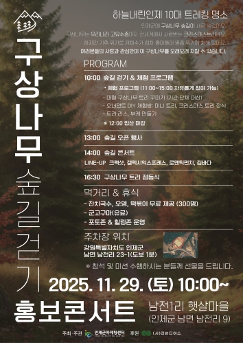 [뉴스스텝] 인제군마케팅센터는 오는 11월 29일 남면 남전리 일원에서 ‘구상나무 숲길 걷기 홍보 콘서트’를 개최한다. 이번 행사는 남전리 지역에 새롭게 개방된 약 6,500그루 규모의 구상나무 숲길을 주민과 관광객에게 소개하고, 구상나무 보전 가치를 널리 알리기 위해 마련됐다.