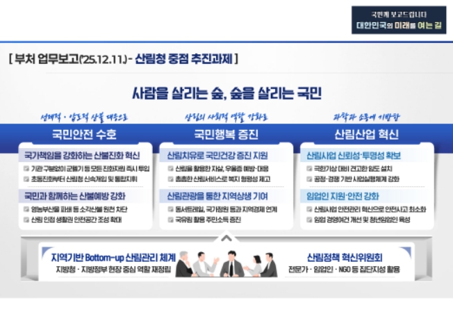 [뉴스스텝] 산림청은 ‘정부 업무보고’를 계기로 ‘사람을 살리는 숲, 숲을 살리는 국민’ 실현을 위한 중점 추진과제를 11일 발표했다.