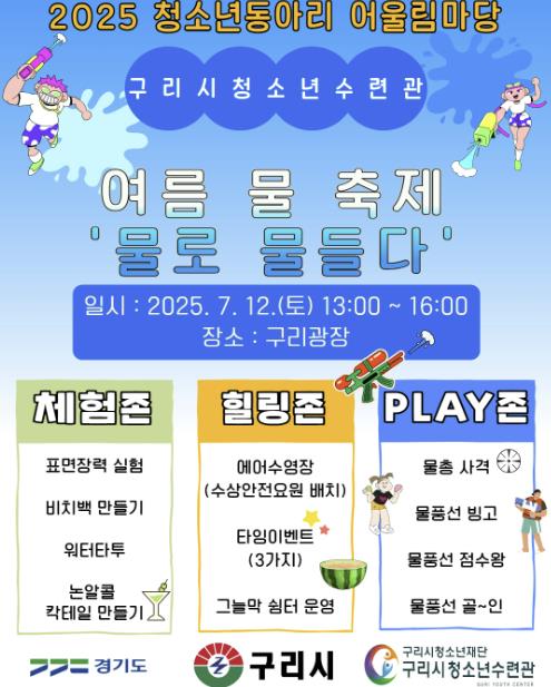 [뉴스스텝] 구리시청소년재단 청소년수련관은 다가오는 여름, 청소년들과 지역 주민들이 함께 시원하게 즐길 수 있는 청소년동아리 어울림마당 ‘여름 물 축제 – 물로 물들다’를 오는 12일 13시부터 16시까지 구리광장에서 운영한다.