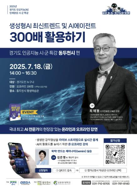 [뉴스스텝] 동두천시는 오는 18일 오후 2시부터, 경기도와 경기도경제과학진흥원이 주최하고 동두천시와 성균관대학교가 주관하는 ‘생성형 인공지능(AI) 특별강연’을 동두천시 평생학습관에서 개최한다고 밝혔다.