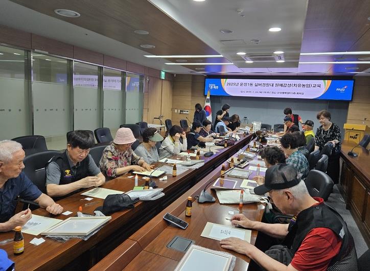 [뉴스스텝] 파주시 운정1동은 지난 24일 운정1동 실버경찰대 봉사단 20명을 대상으로 운정행복센터 회의실에서 원예감성(치유농업)교육을 실시해 큰 호응을 얻었다.
