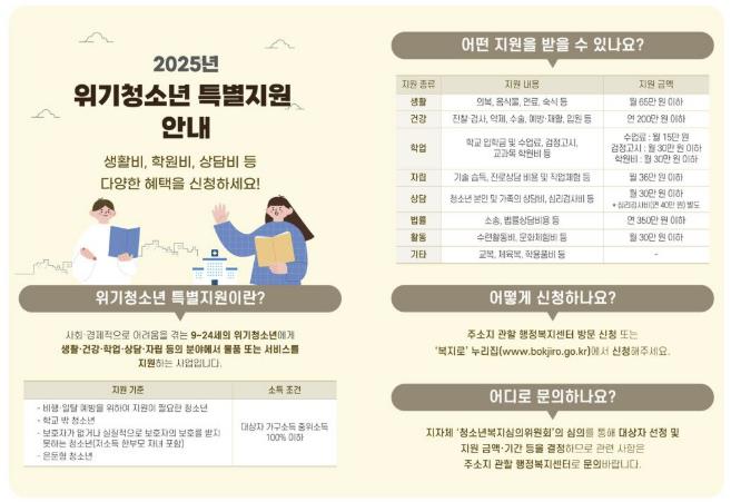 [뉴스스텝] 가평군이 사회‧경제적 어려움에 처한 위기청소년을 대상으로 특별지원 신청을 9월 30일까지 받고 있다. 이번 지원은 '청소년복지지원법' 제14조에 근거해 추진되는 것으로, 보호자가 없거나 실질적 보호를 받지 못하는 청소년과 저소득 한부모 가정 자녀 등이 주요 대상이다.