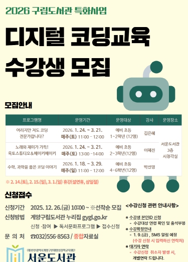[뉴스스텝] 인천 계양구 서운도서관(관장 권문혁)은 초등학생을 대상으로 오는 2026년 1월부터 3월까지 ‘디지털 코딩 교육’을 운영한다고 밝혔다.
