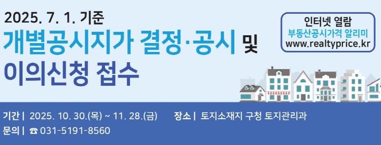 [뉴스스텝] 수원시 영통구는 2025년 7월 1일 기준 개별공시지가를 10월 30일 결정·공시하고, 11월 28일까지 이의신청 기간을 운영한다. 이번에 결정·공시되는 대상은 올해 1월 1일부터 6월 30일까지의 토지 분할, 합병, 지목변경 등 변동 사항이 있는 58필지이다.