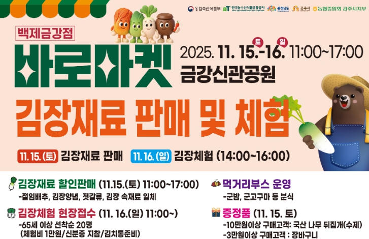 [뉴스스텝] 공주시는 본격적인 김장철을 맞아 지역 농산물 소비를 촉진하고 시민들에게 체험 기회를 제공하기 위해 ‘바로마켓 김장 재료 판매 및 체험 행사’를 오는 15일과 16일 이틀간 공주 금강신관공원에서 연다고 밝혔다.