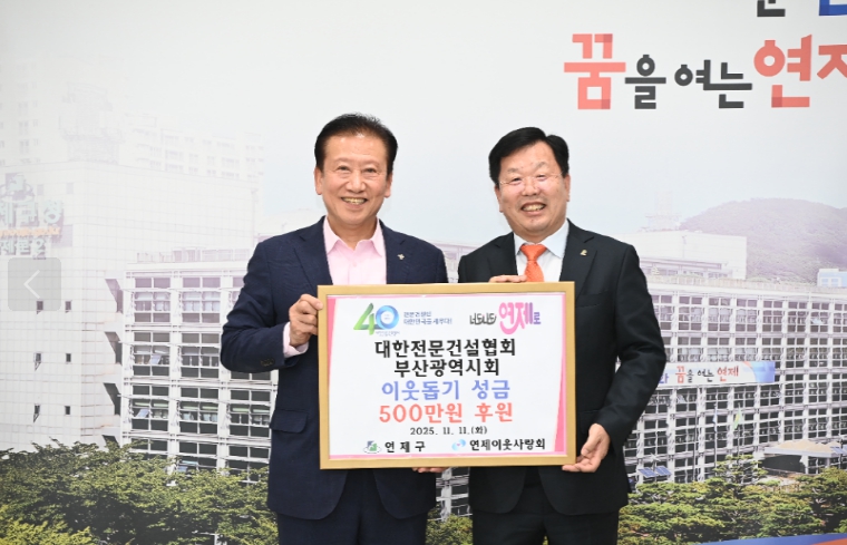 [뉴스스텝] 연제구는 11월 11일 대한전문건설협회 부산광역시회(회장 김형겸)로부터 이웃돕기 성금 500만원을 기탁 받았다. 기탁 받은 성금은 취약계층 지원을 위한 사업에 이용될 예정이다.