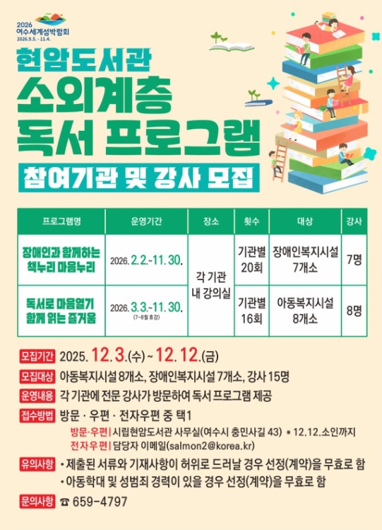 [뉴스스텝] 여수시립현암도서관은 오는 12월 3일부터 12일까지 소외계층 독서 프로그램 참여 기관을 공개 모집한다.