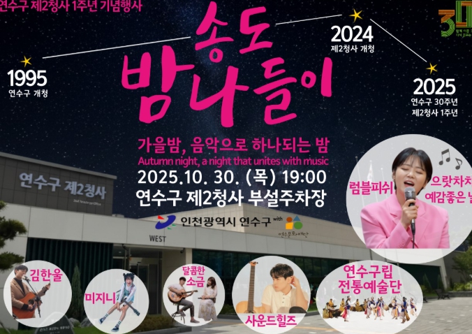 [뉴스스텝] 연수구는 오는 30일 19시 연수구 제2청사 부설주차장 특설무대에서 제2청사 개청 1주년을 지역 주민과 함께 축하하기 위해 기념행사 ‘송도 밤 나들이’를 개최한다.
