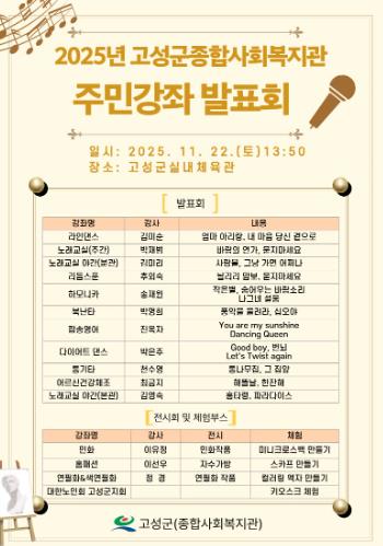 [뉴스스텝] 고성군에서 운영 중인 고성군종합사회복지관에서는 11월 22일14시부터 고성군실내체육관에서 수강생 및 지역주민을 대상으로 2025년 주민강좌 발표회 및 전시회를 개최한다.