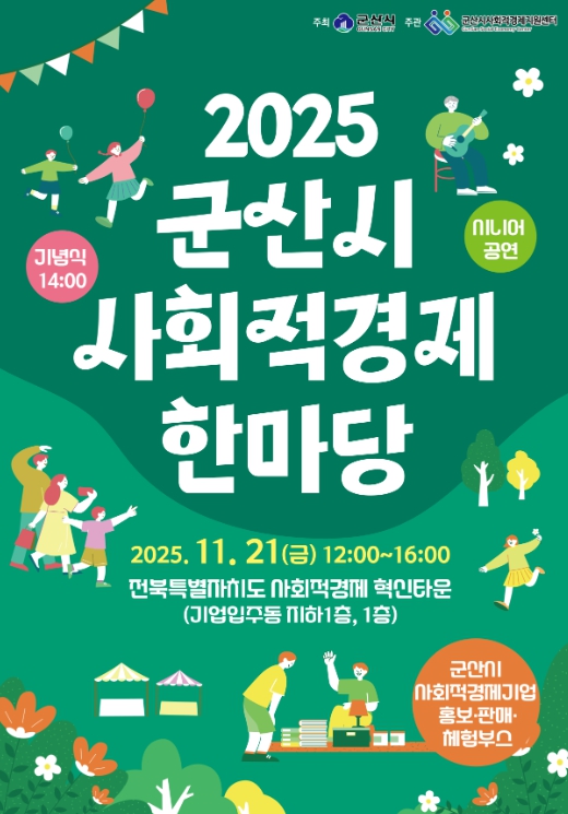 [뉴스스텝] 군산시가 21일, 전북특별자치도 사회적경제 혁신타운(군산시 대학로 600)에서 ‘2025 군산시 사회적경제 한마당’을 개최한다.