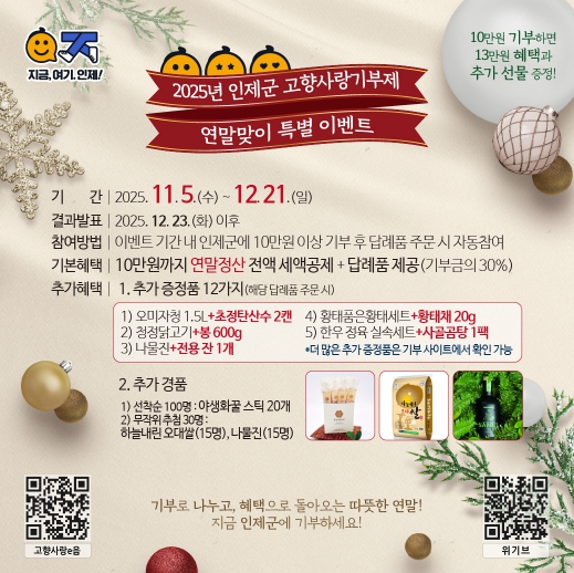 [뉴스스텝] 인제군이 연말을 맞이하여 고향사랑기부제 특별 이벤트를 오는 12월 21일까지 진행한다.