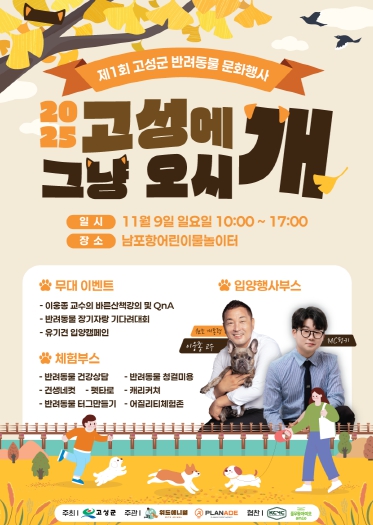 [뉴스스텝] 고성군은 오는 11월 9일 일요일 오전 10시, 남포항 일원(어린이 물놀이터 입구)에서 제1회 반려동물 문화행사 ‘고성에 그냥 오시개’를 개최한다고 밝혔다.