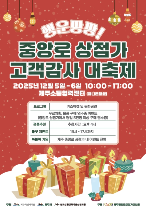 [뉴스스텝] 제주시는 12월 5일과 6일 오전 10시부터 오후 5시까지 중앙로 상점가 일대에서 ‘행운팡팡! 고객감사 대축제’가 개최된다고 밝혔다.