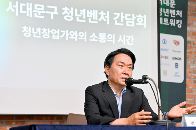 ▲ ‘서대문구 청년벤처 간담회’에서 청년 창업가들과 소통하고 있는 이성헌 서대문구청장