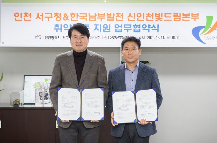 [뉴스스텝] 인천 서구는 지난 11일 한국남부발전(주) 신인천빛드림본부(본부장 김경수)와 함께 취약계층 삶의 질 향상과 지역사회 복지 안전망 강화를 위한 업무협약(MOU)을 체결했다.