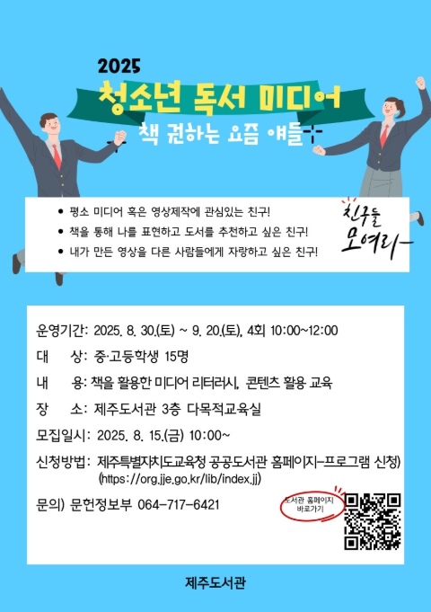 [뉴스스텝] 제주도교육청 제주도서관은 오는 30일부터 다음 달 20일까지 매주 토요일 오전 10시 청소년을 대상으로 ‘2025년 청소년 독서미디어: 책 권하는 요즘 얘들’ 프로그램을 제주도서관 3층 다목적교육실에서 운영한다.